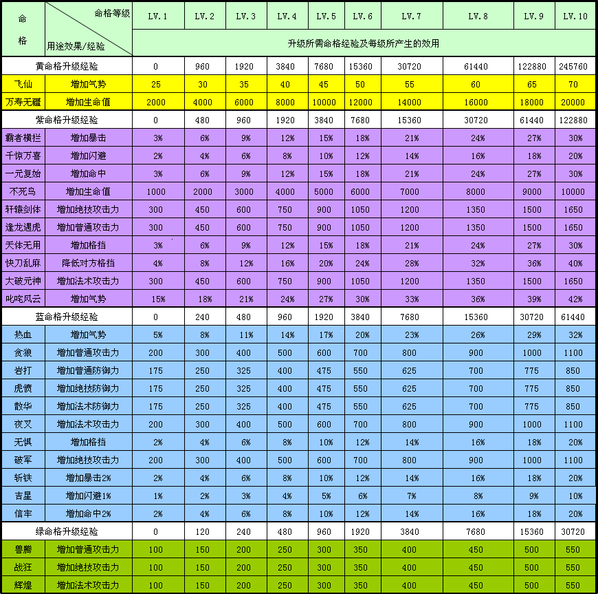 先上个图,看一下各种命格的效用及其升级经验。